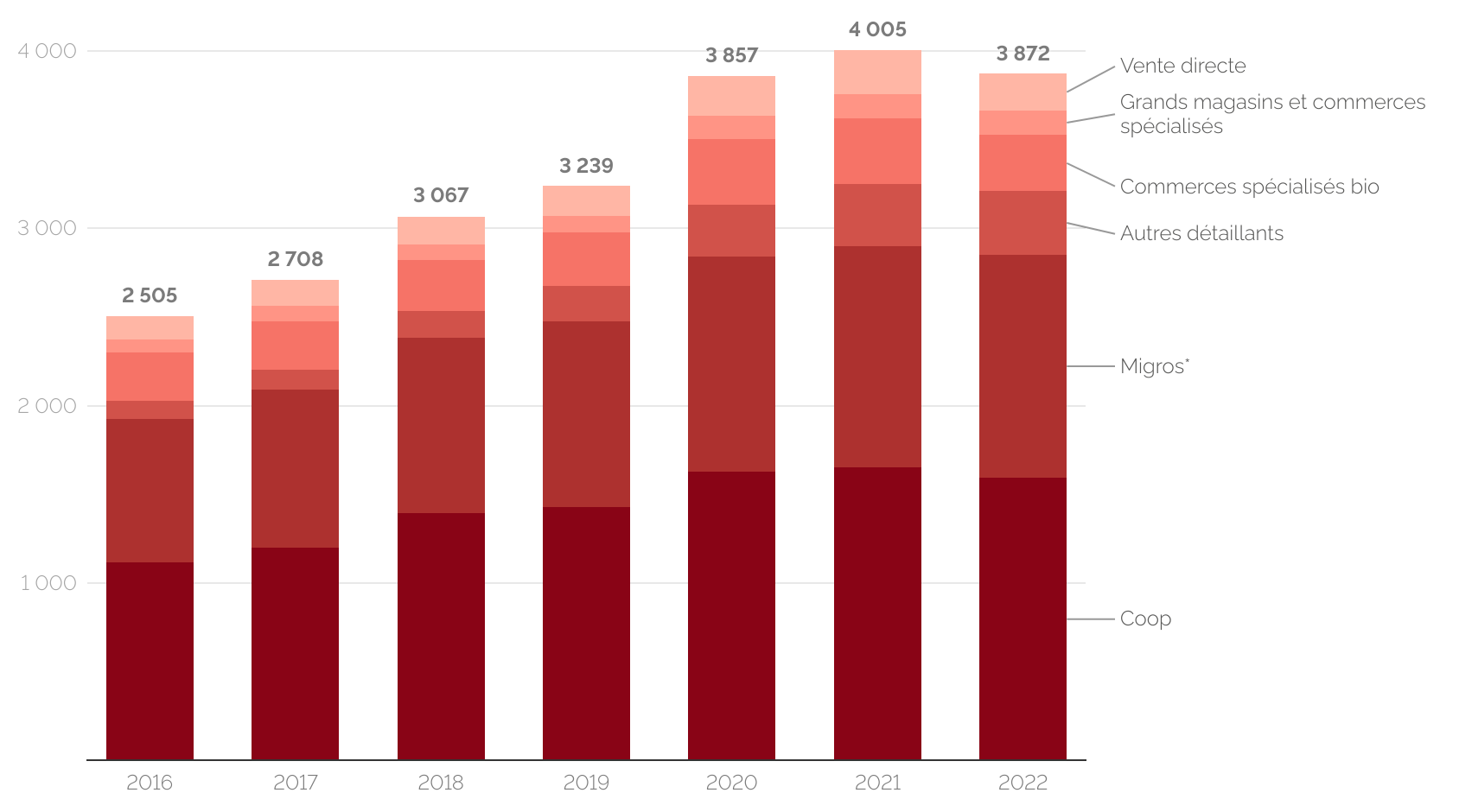 Economie suisse En graphiques – Les ventes de produits bios reculent en Suisse, comme ailleurs en Europe Après des années de hausse, les ventes de produits bios sont en baisse en 2022. Le recul est cependant plus contenu qu'en France où la filière a connu un repli pour la seconde année consécutive | |