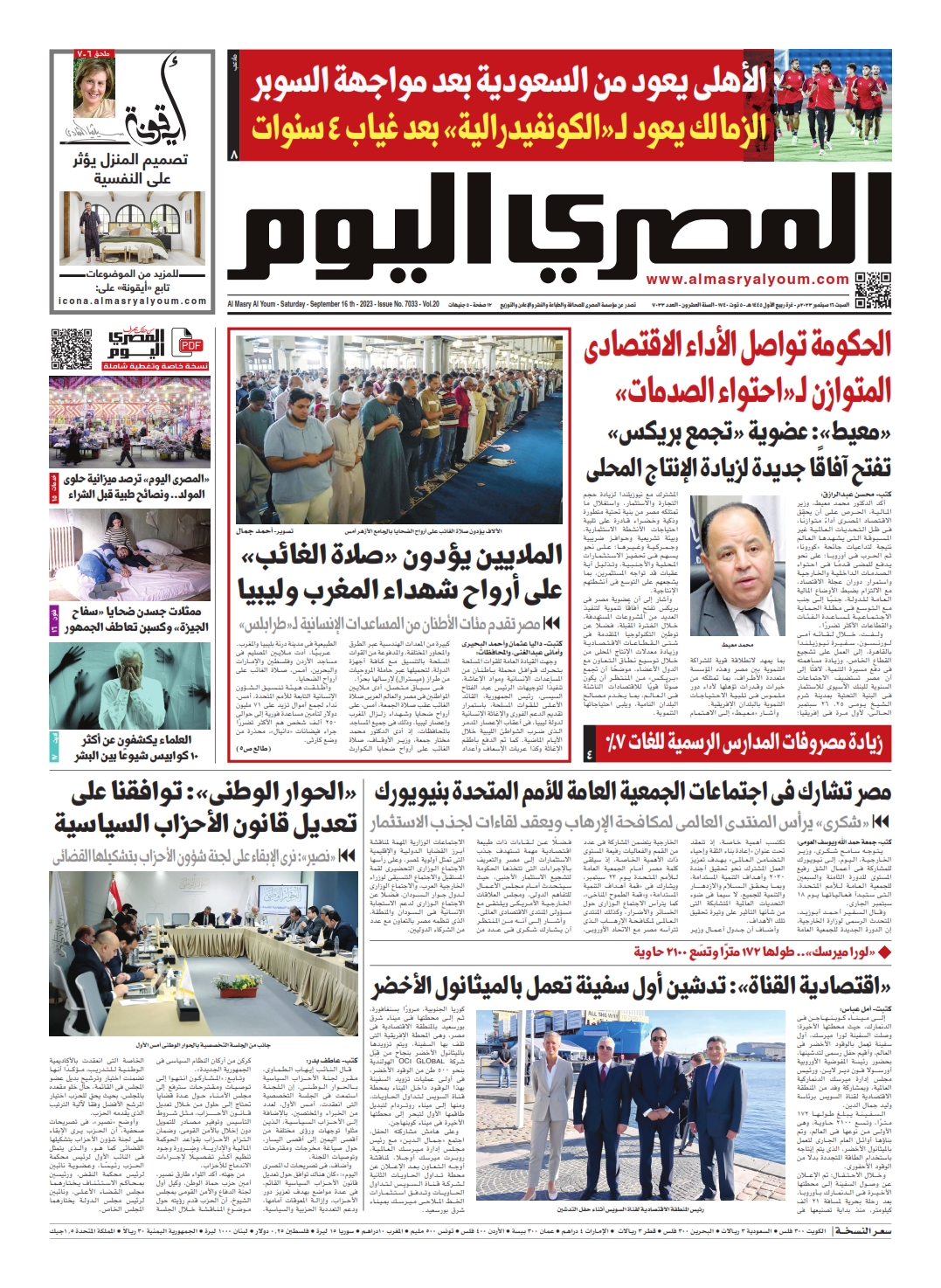 نبدأ معكم عددنا ليوم السبت 16 سبتمبر 2023.. وفيه نتابع: