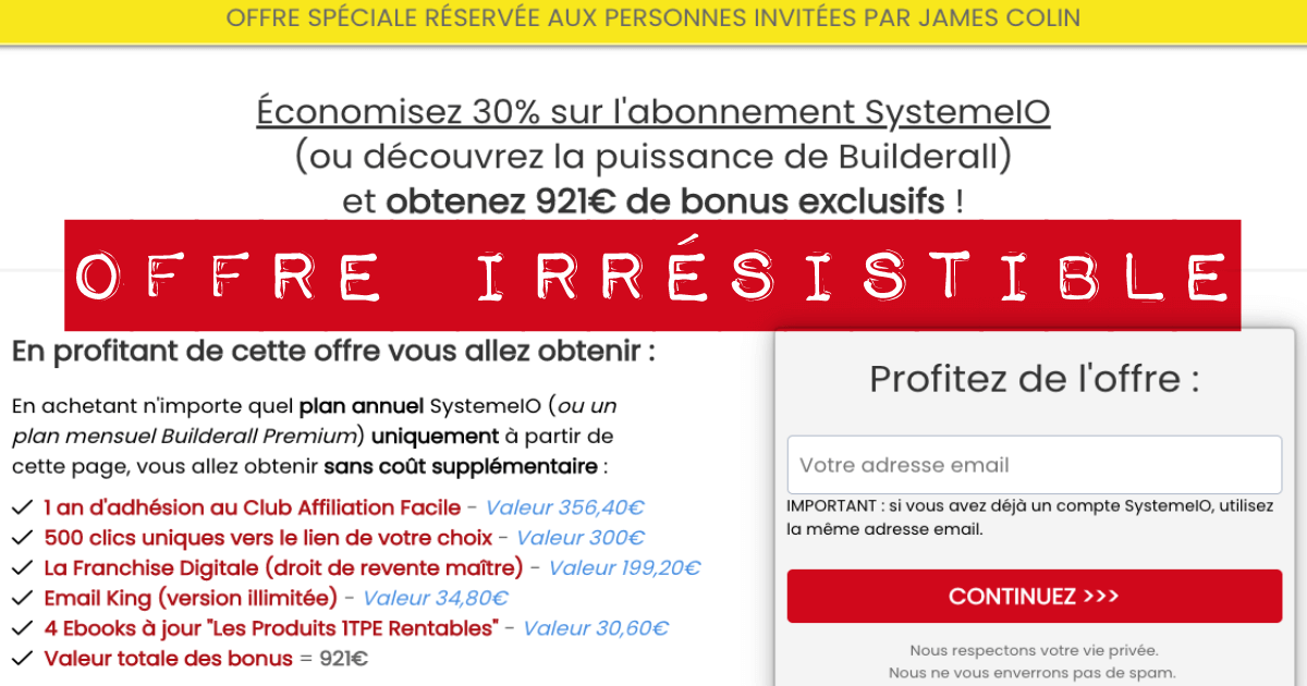 “Vous pouvez acheter votre plan annuel directement sur le site de SystemeIO ou en passant par le lien d'un autre affilié. C'est exactement pareil pour votre plan mensuel Builderall. Cela ne vous coûtera pas moins cher (ni plus cher) mais vous n'aurez pas ces bonus.”