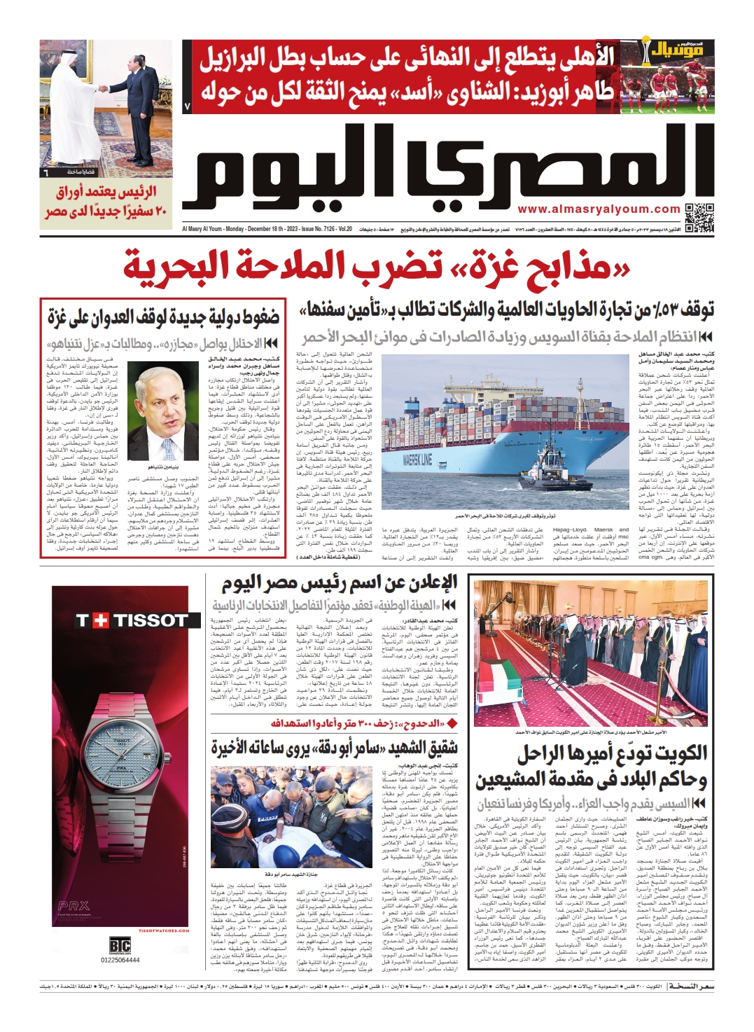 من أبرز الأخبار: «مذابح غزة» تضرب الملاحة البحرية، أعلنت شركات شحن عملاقة تمثل نحو 53% من تجارة الحاويات العالمية وقف رحلاتها عبر البحر الأحمر؛ ردا على اعتراض جماعة الحوثى فى اليمن بعض السفن قرب مضيق باب المندب، فيما أكدت قناة السويس انتظام الملاحة بها، ومراقبتها للوضع عن كثب.