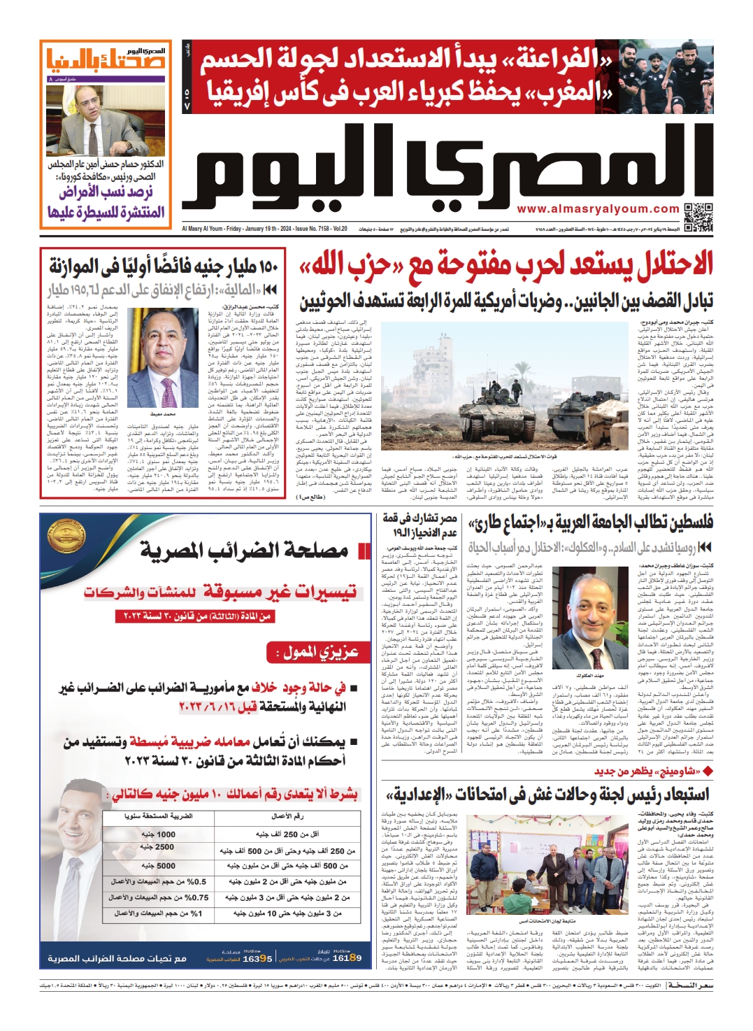نبدأ معكم عددنا ليوم الجمعة 19 يناير 2024.. وفيه نتابع: الاحتلال يستعد لحرب مفتوحة مع «حزب الله»، أعلن جيش الاحتلال الإسرائيلى، حتمية دخول حرب مفتوحة مع حزب الله اللبنانى، خلال الأشهر القليلة المقبلة، واستهدف الحزب مواقع إسرائيلية، وردت مدفعية الاحتلال بضرب القرى البنانية.