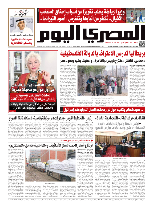 نبدأ معكم عددنا ليوم الأربعاء 31 يناير 2024.. وفيه نتابع: بريطانيا تدرس الاعتراف بالدولة الفلسطينية، شهدت أزمة الحرب فى غزة والأراضى الفلسطينية المحتلة العديد من التطورات على المستويين السياسى والميدانى، فيما أعلن وزير الخارجية البريطانى، ديفيد كاميرون، أن بلاده تدرس الاعتراف رسميًا بـ«الدولة الفلسطينية».