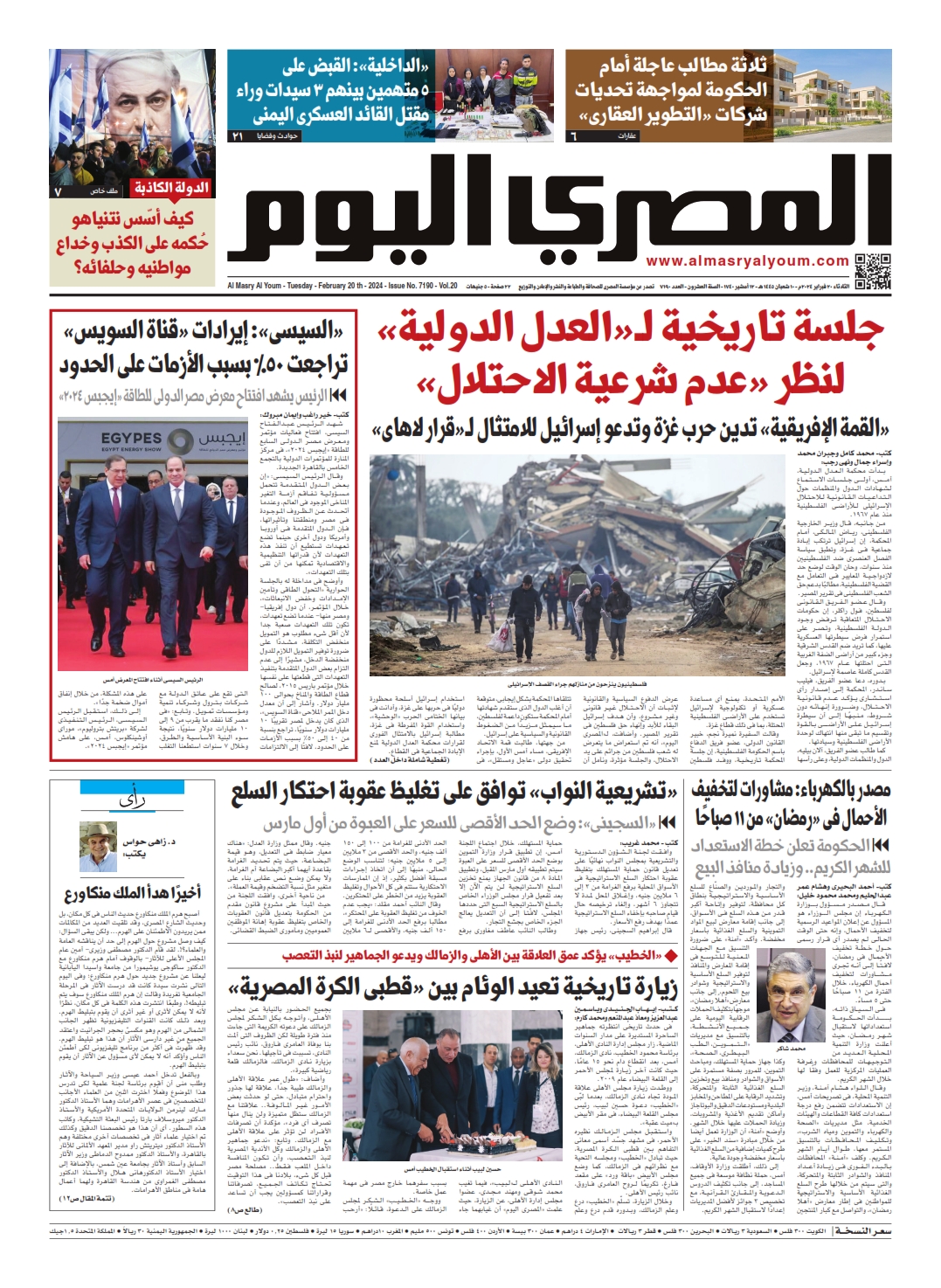 نبدأ معكم عددنا ليوم الثلاثاء 20 فبراير 2024.. وفيه نقرأ في أبرز الأخبار: «السيسى»: إيرادات «قناة السويس» تراجعت 50% بسبب الأزمات على الحدود، شهد الرئيس عبدالفتاح السيسى، افتتاح فعاليات مؤتمر ومعرض مصر الدولى السابع للطاقة «إيجبس 2024»، فى مركز المنارة للمؤتمرات الدولية بالتجمع الخامس بالقاهرة الجديدة، وقال الرئيس السيسى: «إن بعض الدول المتقدمة تتحمل مسؤولية تفاقم أزمة التغير المناخى الموجود فى العالم، وعندما أتحدث عن الظروف الموجودة فى مصر ومنطقتنا وتأثيراتها.