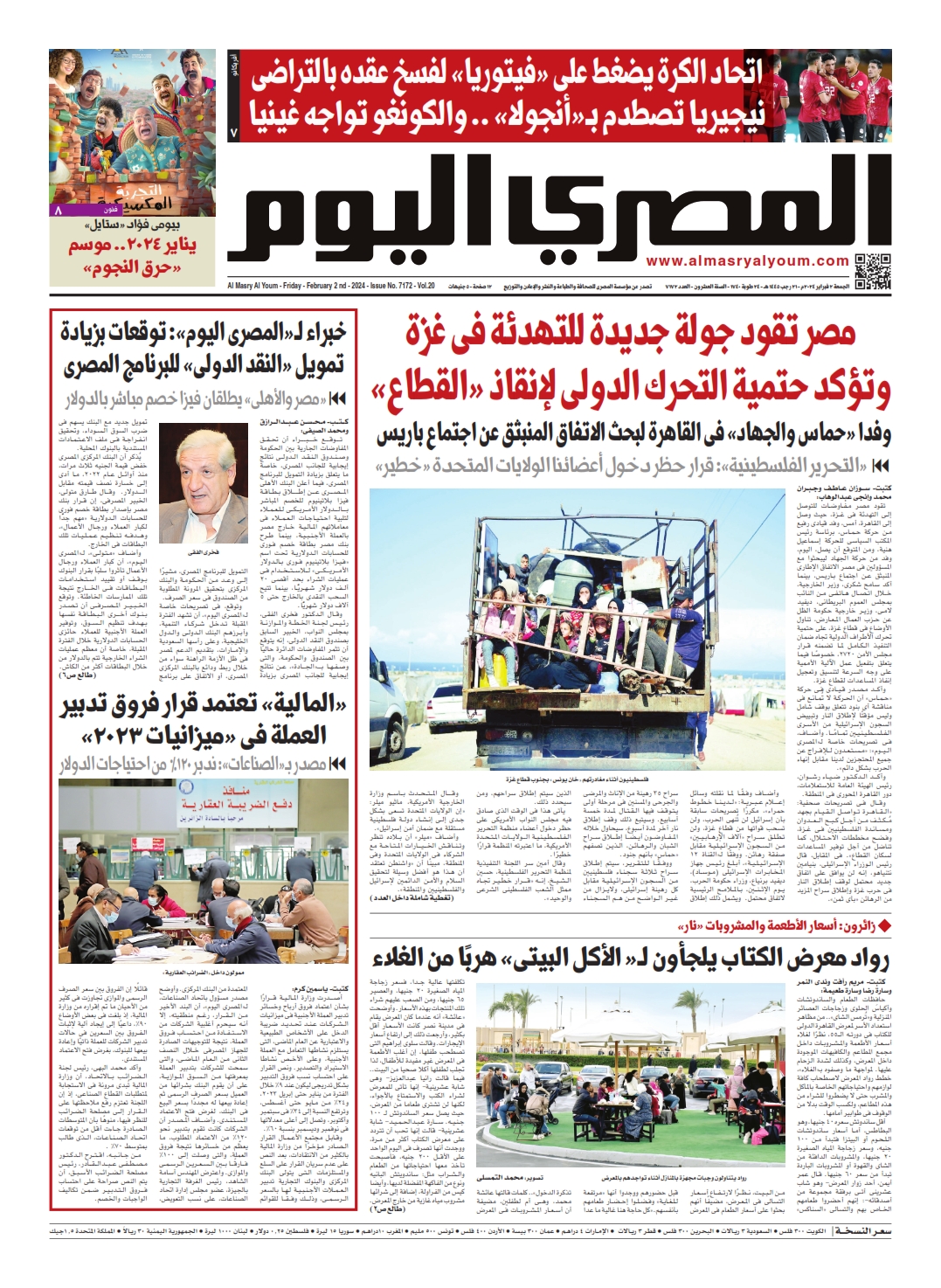 نبدأ معكم عددنا ليوم الجمعة 2 فبراير 2024.. وفيه نتابع: مصر تقود جولة جديدة للتهدئة فى غزة وتؤكد حتمية التحرك الدولى لإنقاذ «القطاع»، تقود مصر مفاوضات للتوصل إلى تهدئة فى غزة، حيث وصل إلى القاهرة، أمس، وفد قيادى رفيع من حركة حماس، برئاسة رئيس المكتب السياسى للحركة إسماعيل هنية، ومن المتوقع أن يصل، اليوم، وفد من حركة الجهاد ليبحثوا مع المسؤولين فى مصر الاتفاق الإطارى المنبثق عن اجتماع باريس.