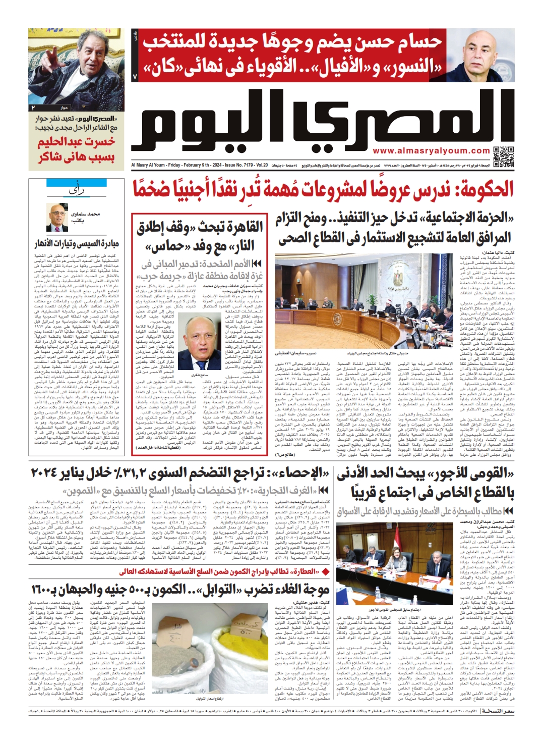 نبدأ معكم عددنا ليوم الجمعة 9 فبراير 2024.. وفيه نتابع: نقرأ في أبرز الأخبار: الحكومة: ندرس عروضًا لمشروعات مُهمة تُدر نقدًا أجنبيًا ضخمًا، أعلنت الحكومة بدء لجنة قانونية وفنية مُشكلة بمجلس الوزراء، لدراسة عروض استثمار فى مشروعات مُهمة، من المقرر أن تُدر موارد ضخمة من النقد الأجنبى.
