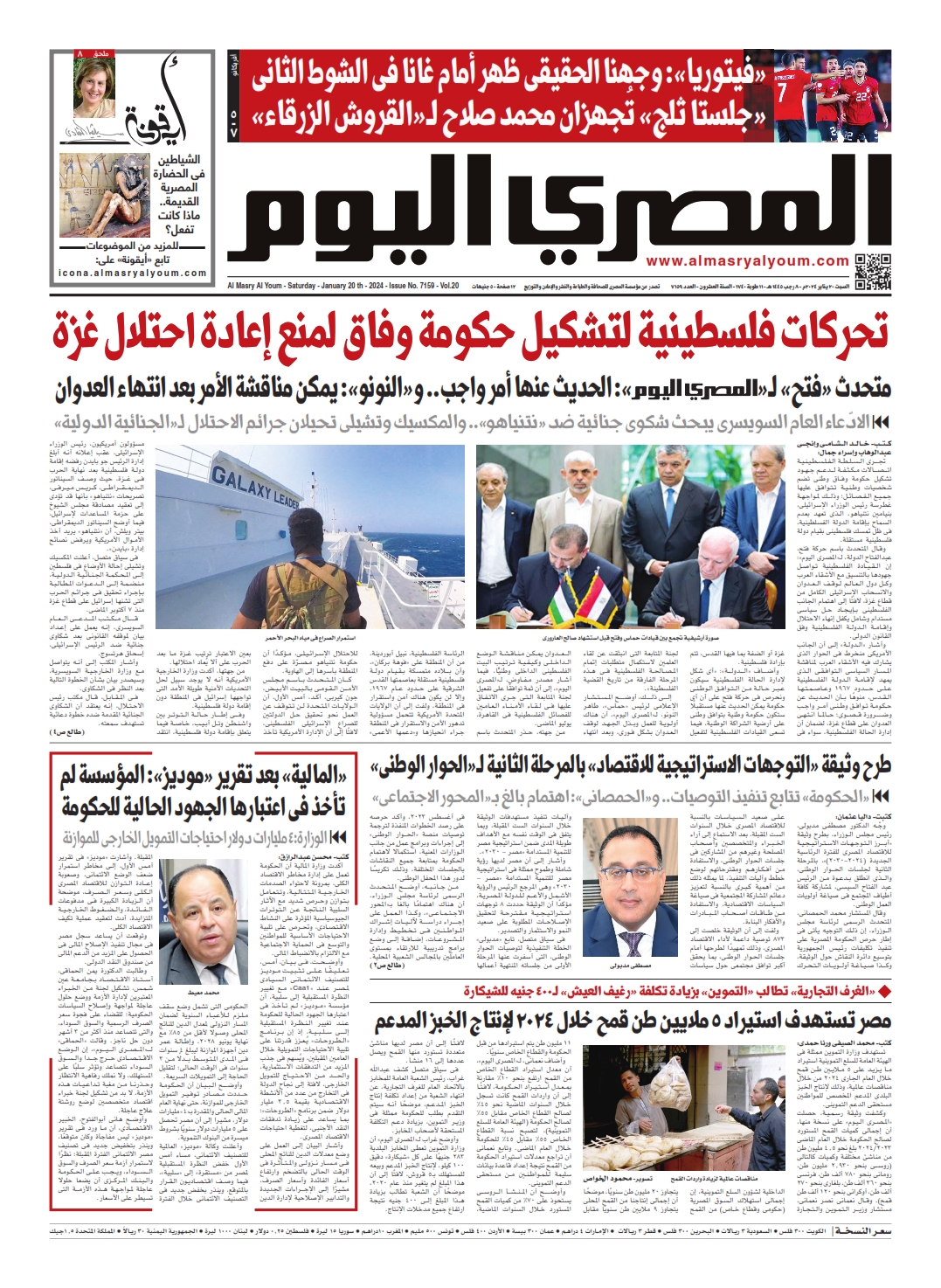 نبدأ معكم عددنا ليوم السبت 20 يناير 2024.. وفيه نتابع: تحركات فلسطينية لتشكيل حكومة وفاق لمنع إعادة احتلال غزة، تجرى السلطات الفلسطينية اتصالات مكثفة لدعم جهود تشكيل حكومة وفاق وطنى تضم شخصيات وطنية تتوافق عليها جميع الفصائل؛ وذلك لمواجهة غطرسة رئيس الوزراء الإسرائيلى، بنيامين نتنياهو، الذى تعهد بعدم السماح بإقامة الدولة الفلسطينية، فى ظل تمسك فلسطينى بقيام دولة فلسطينية مستقلة.